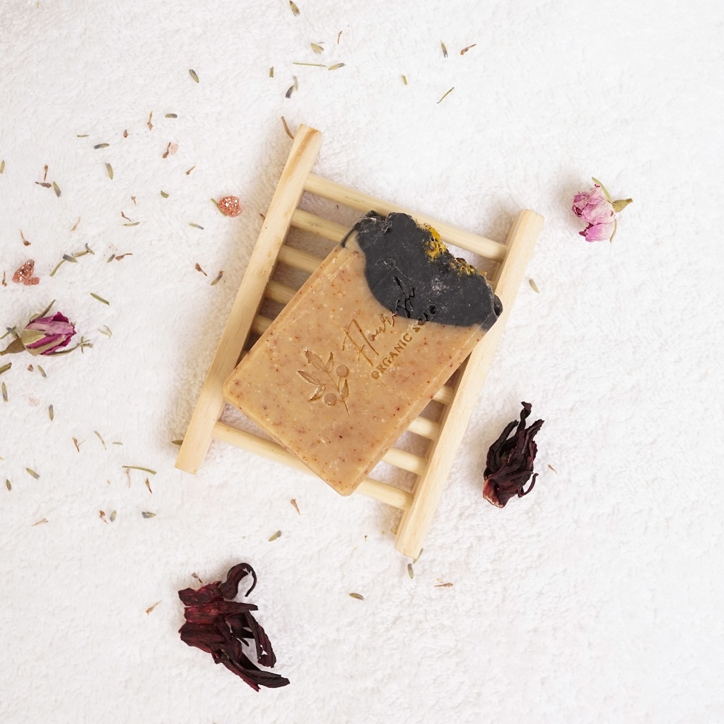 Propriétés : Notre savon Eclat detox charbon & curcuma, surgras à 5%, Antioxydant, hydratant, exfoliant et éclaircissant au doux parfum musqué